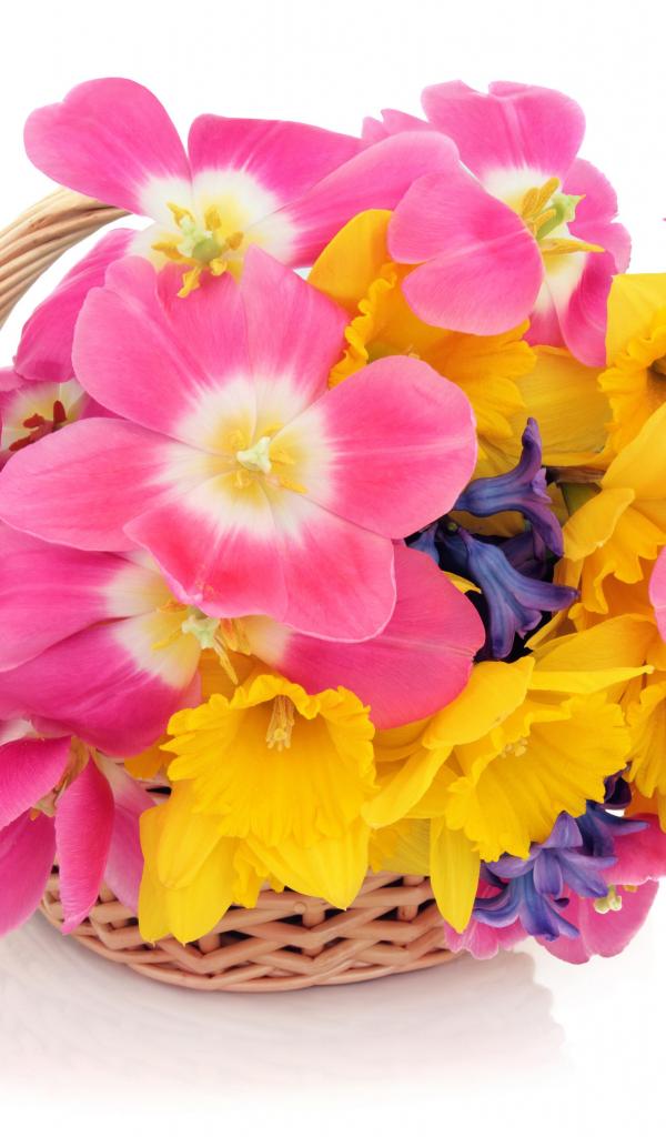 Обои Розовые тюльпаны, нарциссы и гиацинты в корзине на белом фоне