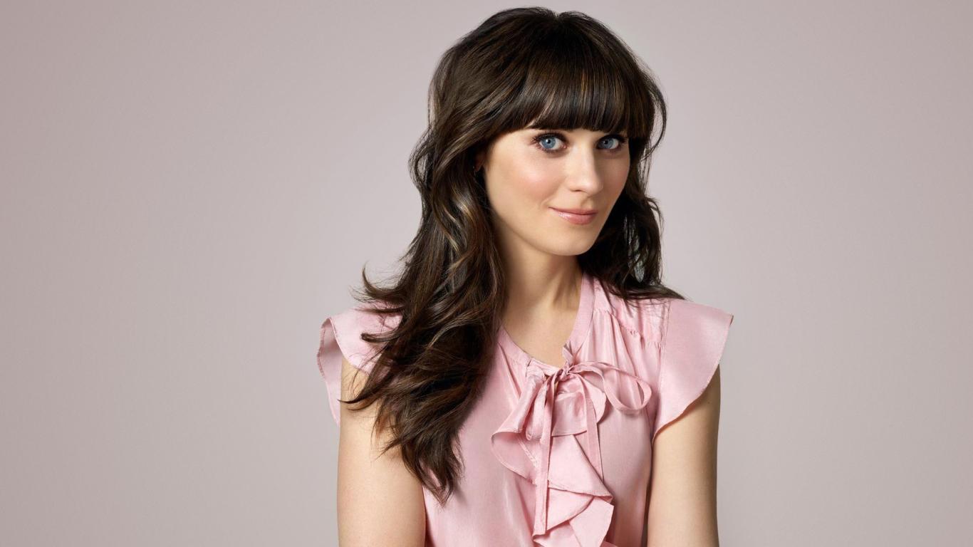 Обои Актриса Зоуи Дешанель в розовом платье на сером фоне