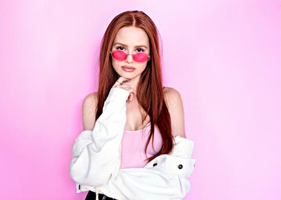 Обои Рыжеволосая актриса Мэделин Петш на розовом фоне
