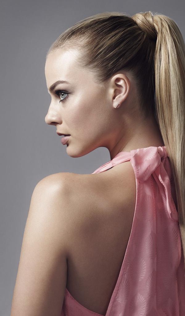 Обои Длинноволосая блондинка актриса Марго Робби фото на сером фоне