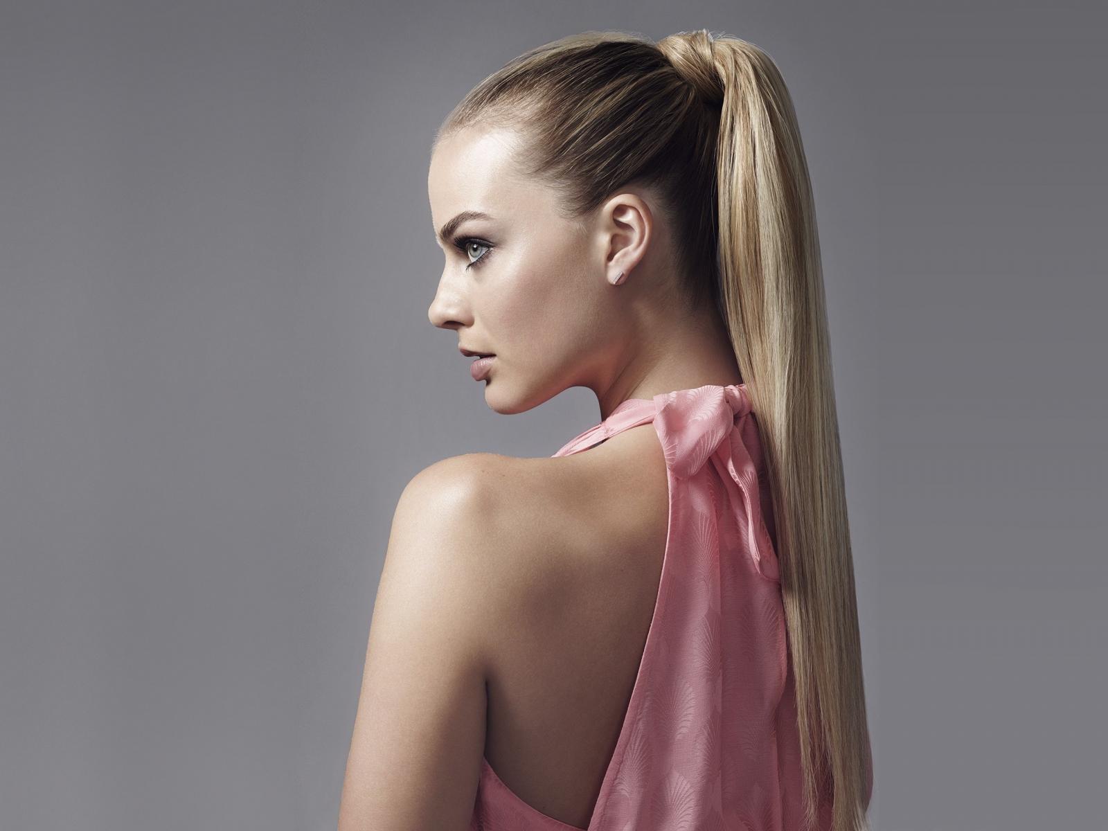 Обои Длинноволосая блондинка актриса Марго Робби фото на сером фоне