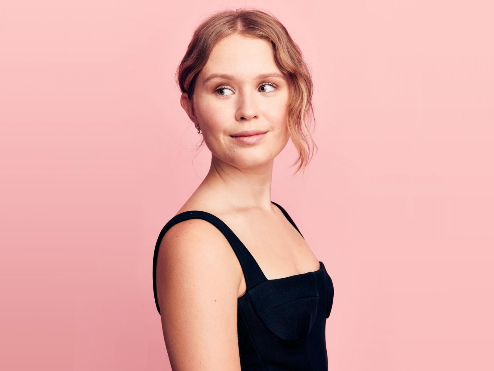 Обои Красивая актриса Элайза Сканлен фото на розовом фоне