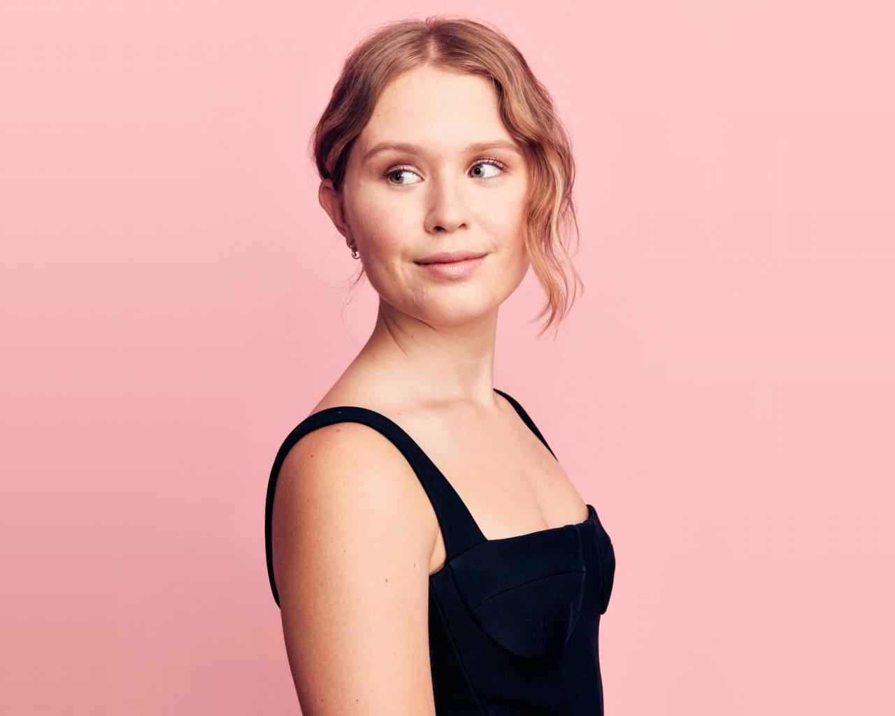 Обои Красивая актриса Элайза Сканлен фото на розовом фоне