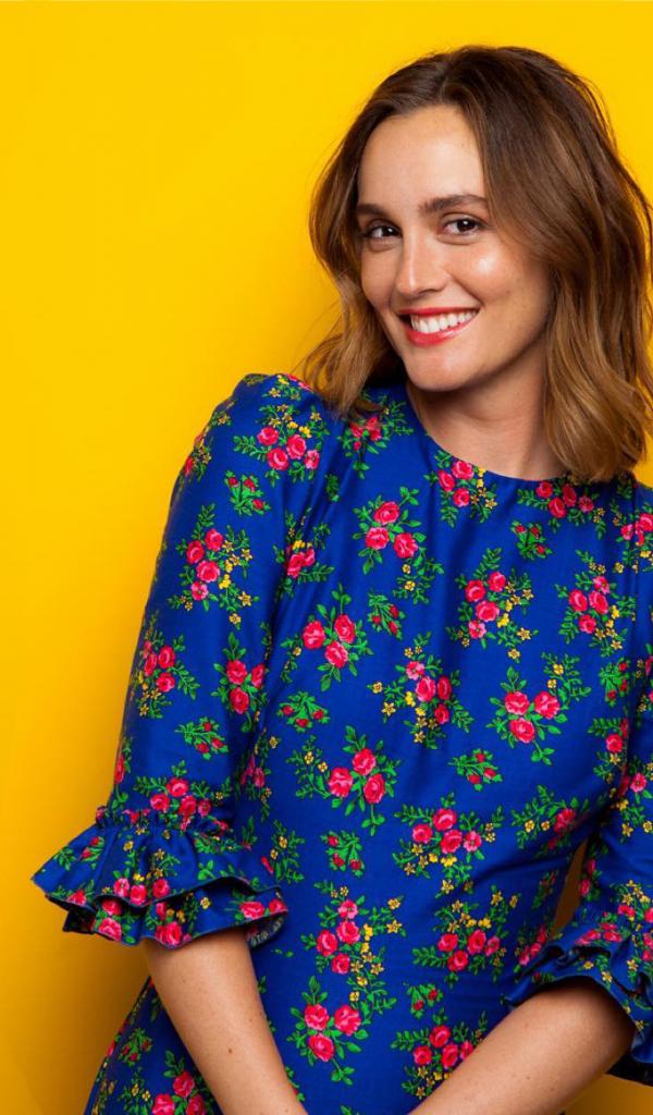 Обои Улыбающаяся актриса Лейтон Мистер в красивом платье на желтом фоне