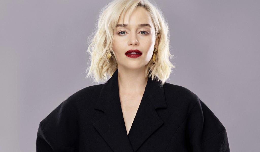 Обои Яркая блондинка, актриса Эмилия Кларк в черном пальто на сером фоне