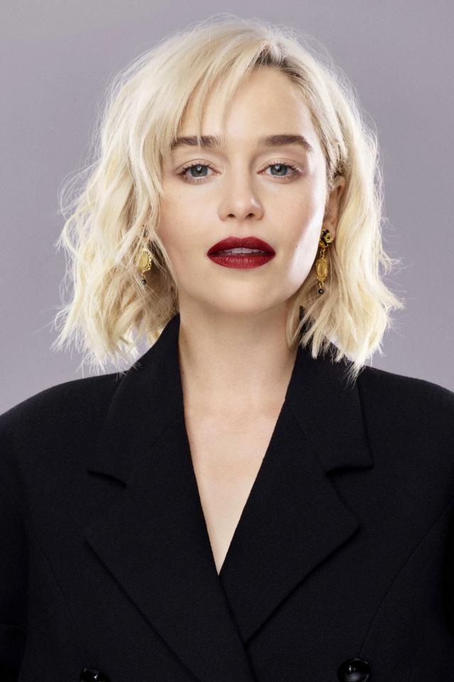 Обои Яркая блондинка, актриса Эмилия Кларк в черном пальто на сером фоне