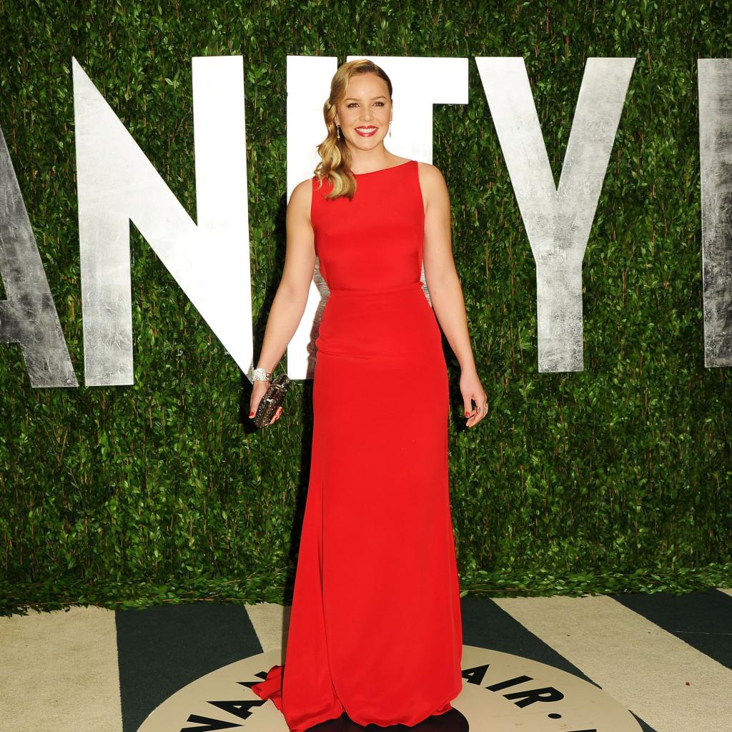 Обои Улыбающаяся девушка, актриса Эбби Корниш в красном платье