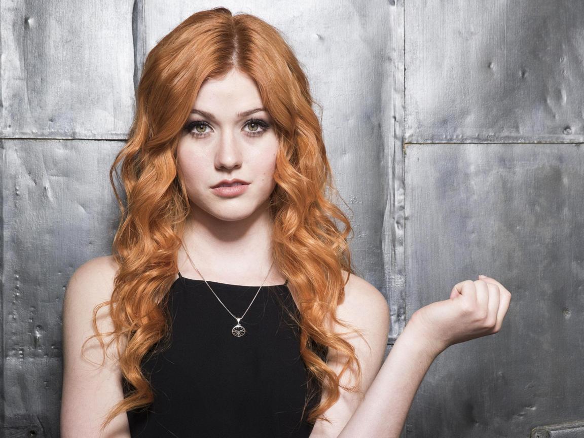 Обои Красивая рыжеволосая девушка, актриса Кэтрин Макнамара на сером фоне