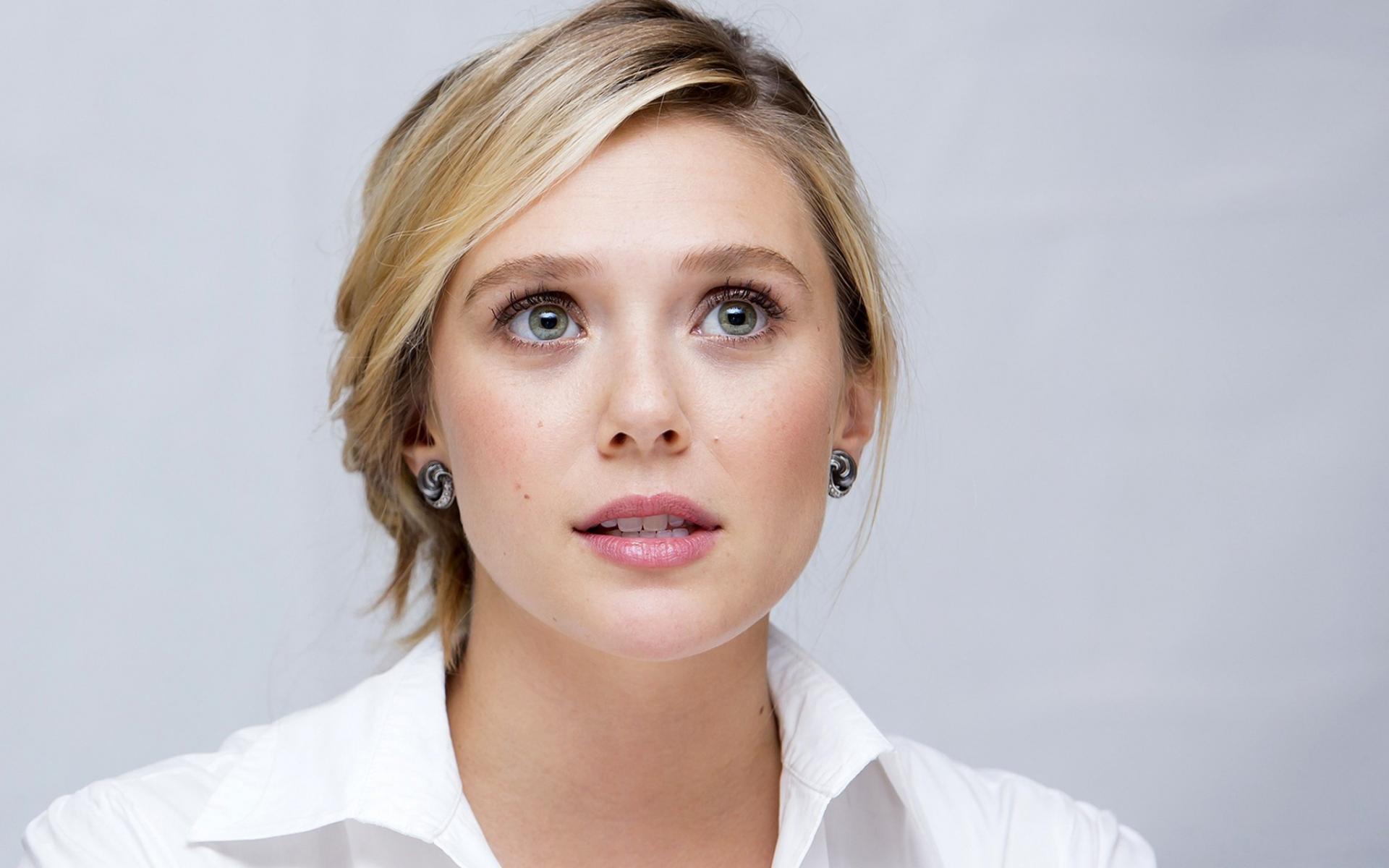 Обои Красивая нежная блондинка, актриса Элизабет Олсен на сером фоне