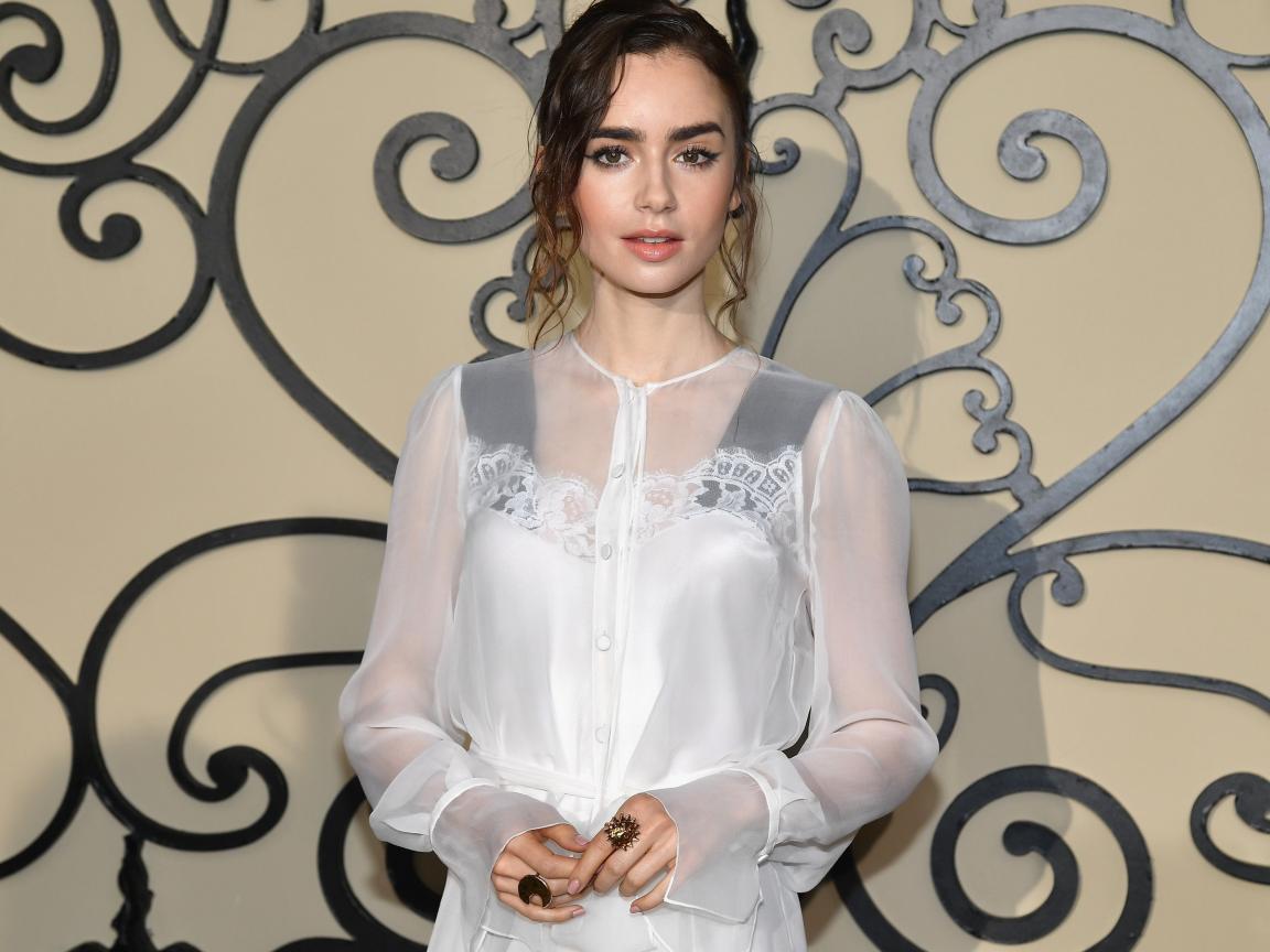 Обои Красивая нежная девушка, актриса Лили Коллинз в белом наряде
