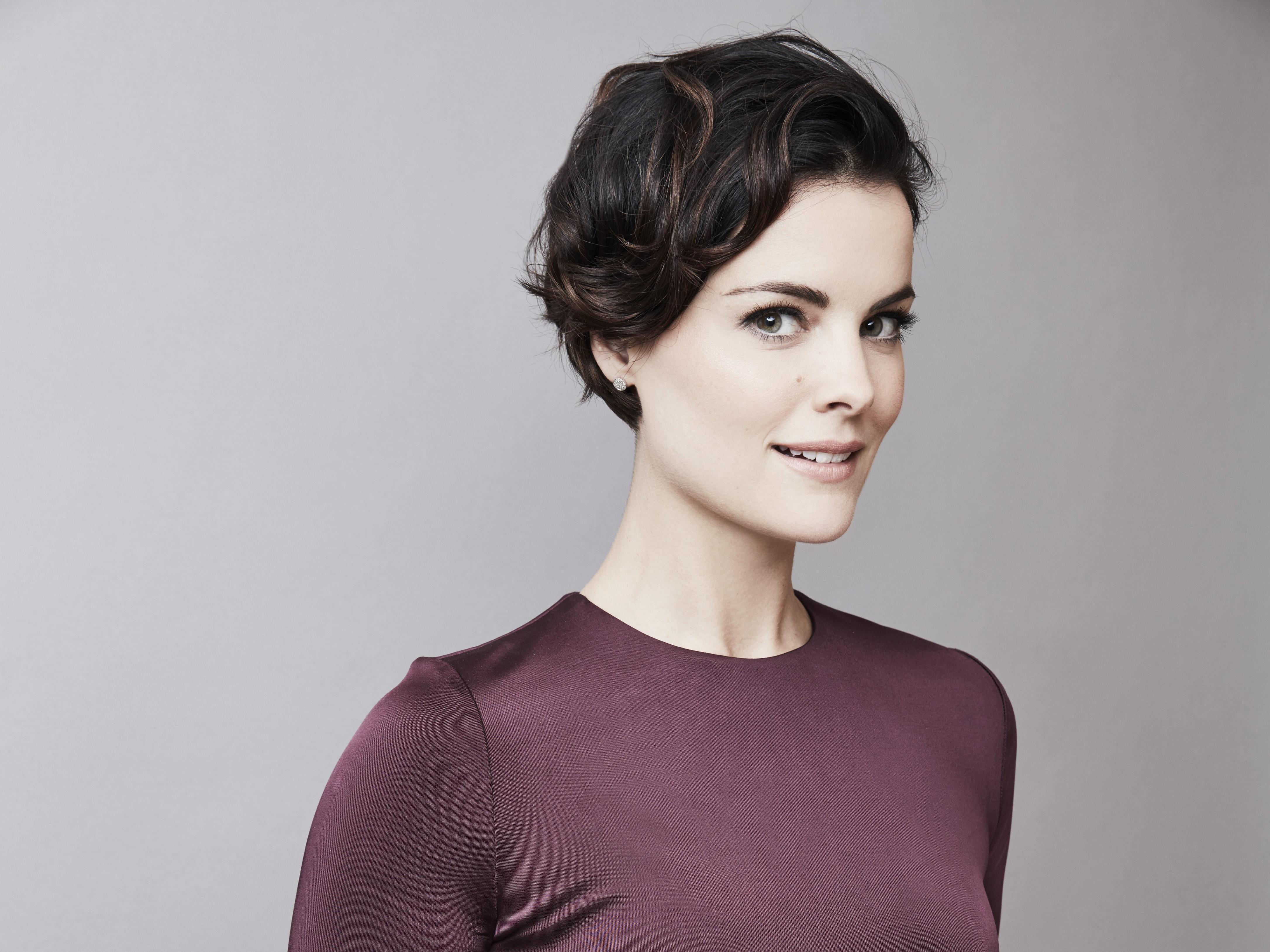 Обои Улыбающаяся девушка, актриса Джейми Александр на сером фоне
