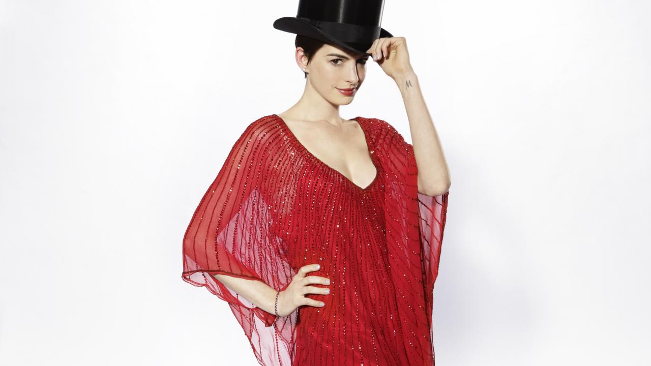 Обои Актриса Энн Хэтэуэй в черном цилиндре на белом фоне