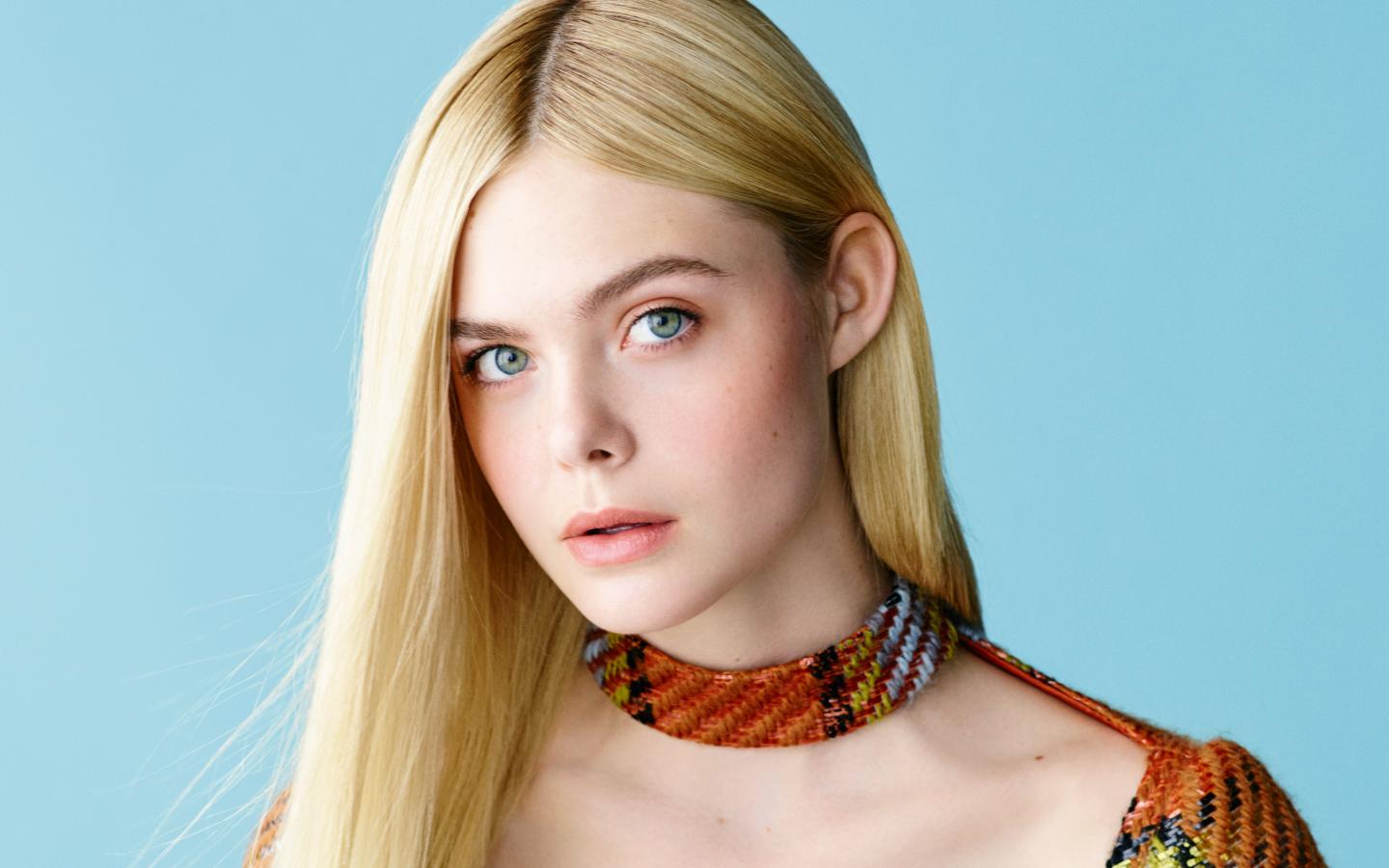Обои Зеленоглазая блондинка, актриса Эль Фаннинг на голубом фоне