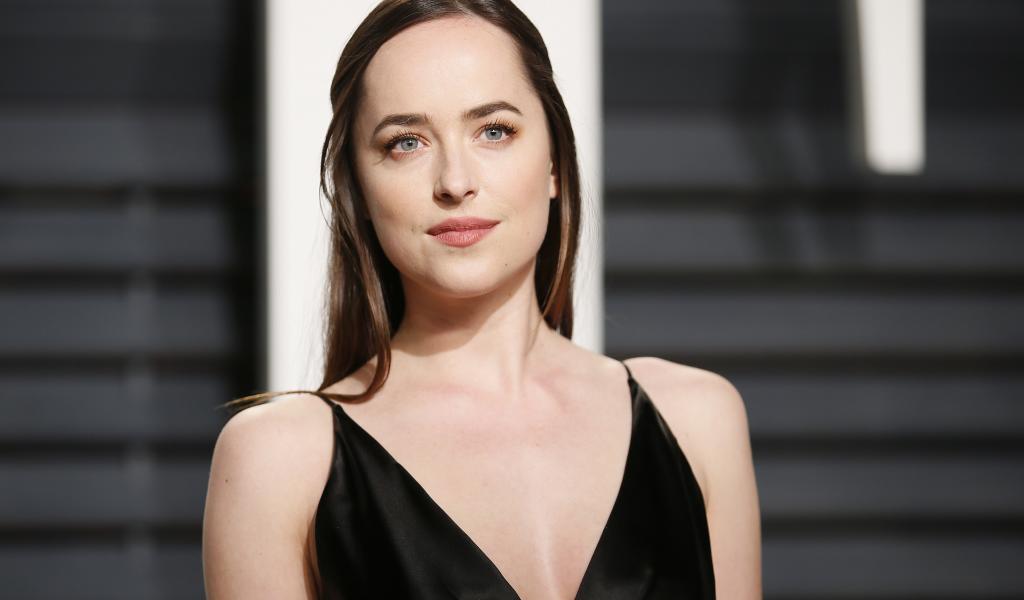 Обои Красивая голубоглазая девушка актриса Дакота Джонсон в черном платье