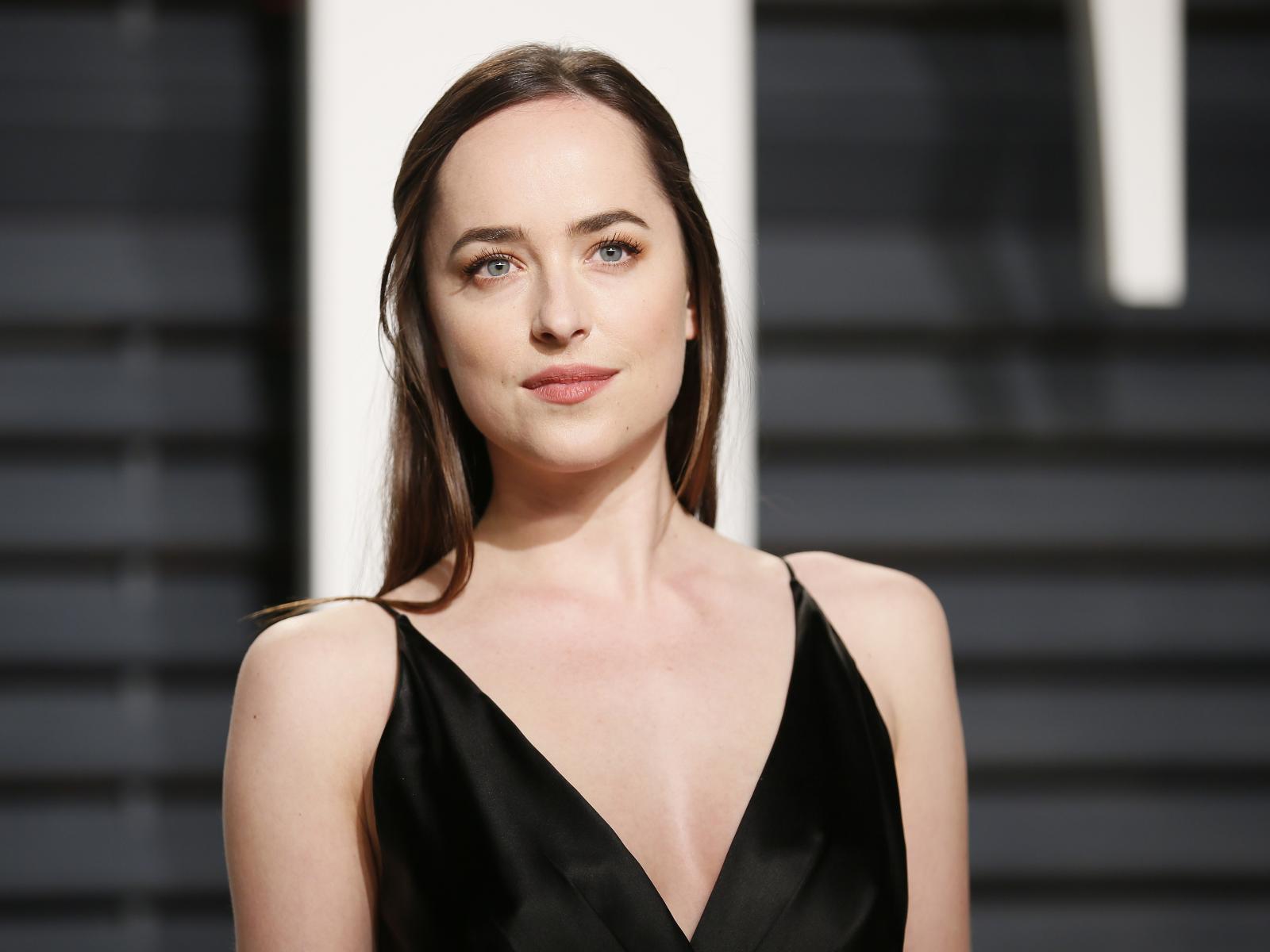 Обои Красивая голубоглазая девушка актриса Дакота Джонсон в черном платье