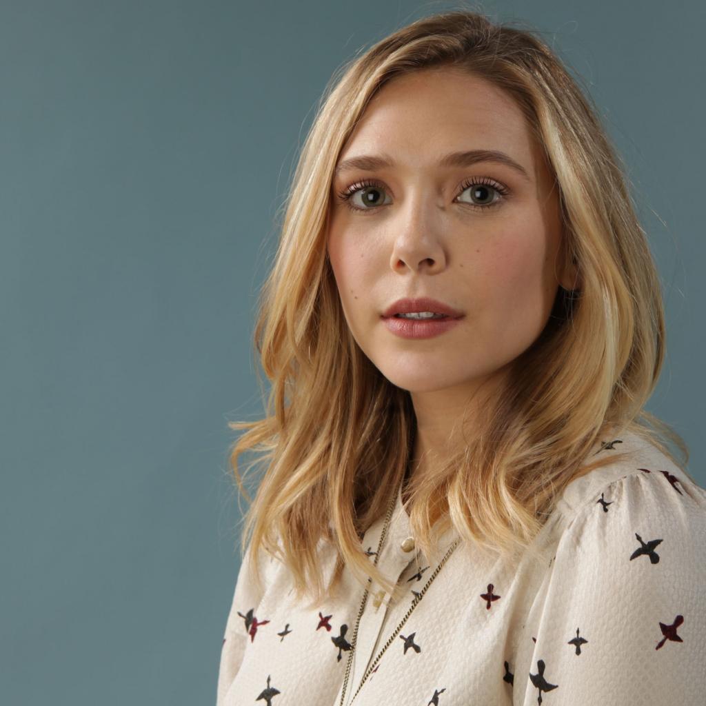 Обои Нежная девушка, актриса Элизабет Олсен на сером фоне