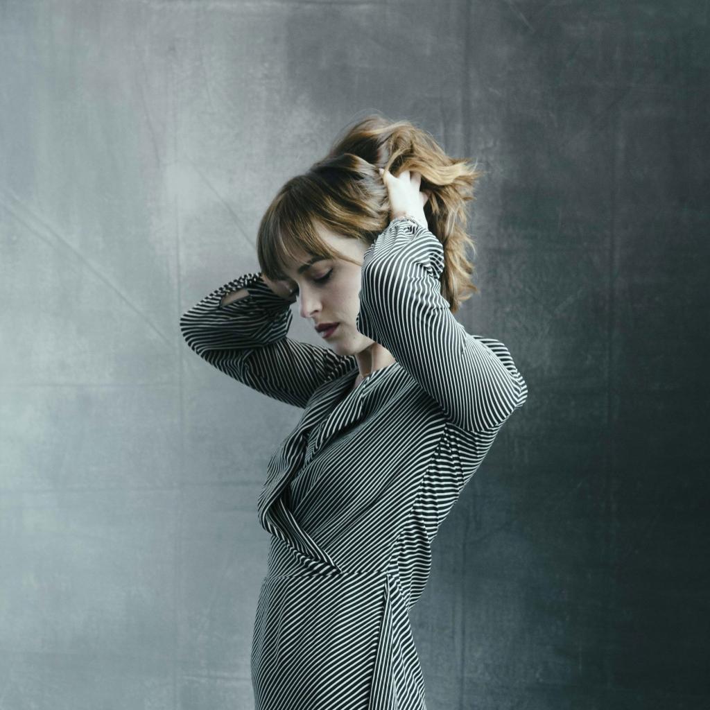 Обои Актриса Дакота Джонсон в платье с руками в волосах