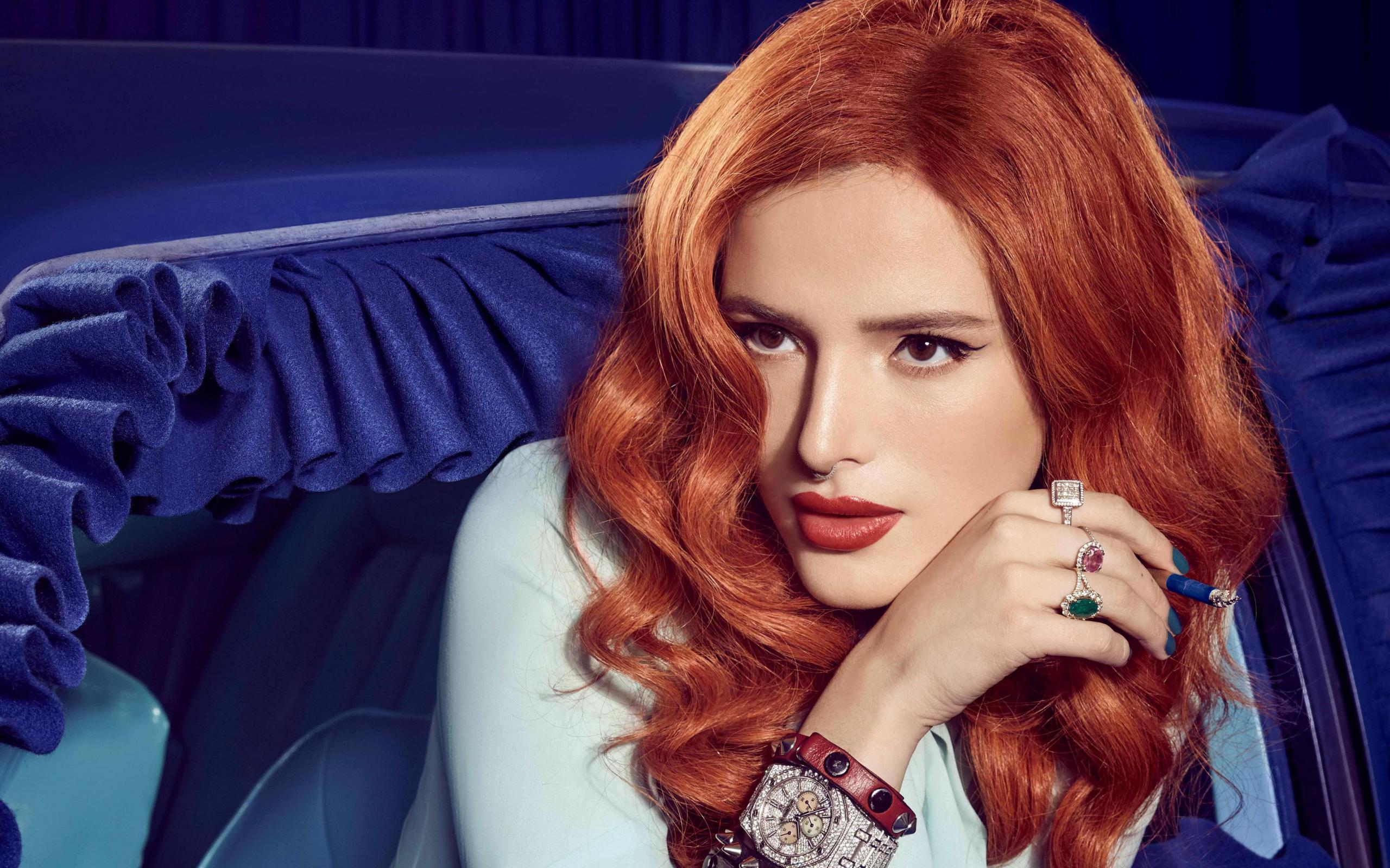 Обои Рыжеволосая девушка, актриса Белла Торн в синем автомобиле