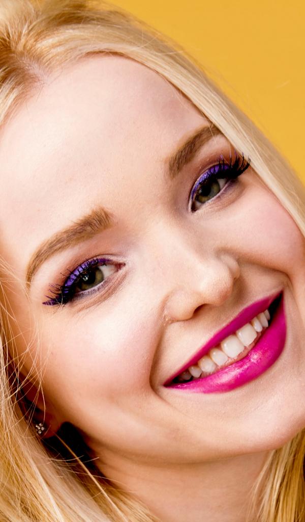 Обои Улыбающаяся девушка актриса Дав Кэрон на желтом фоне крупным планом
