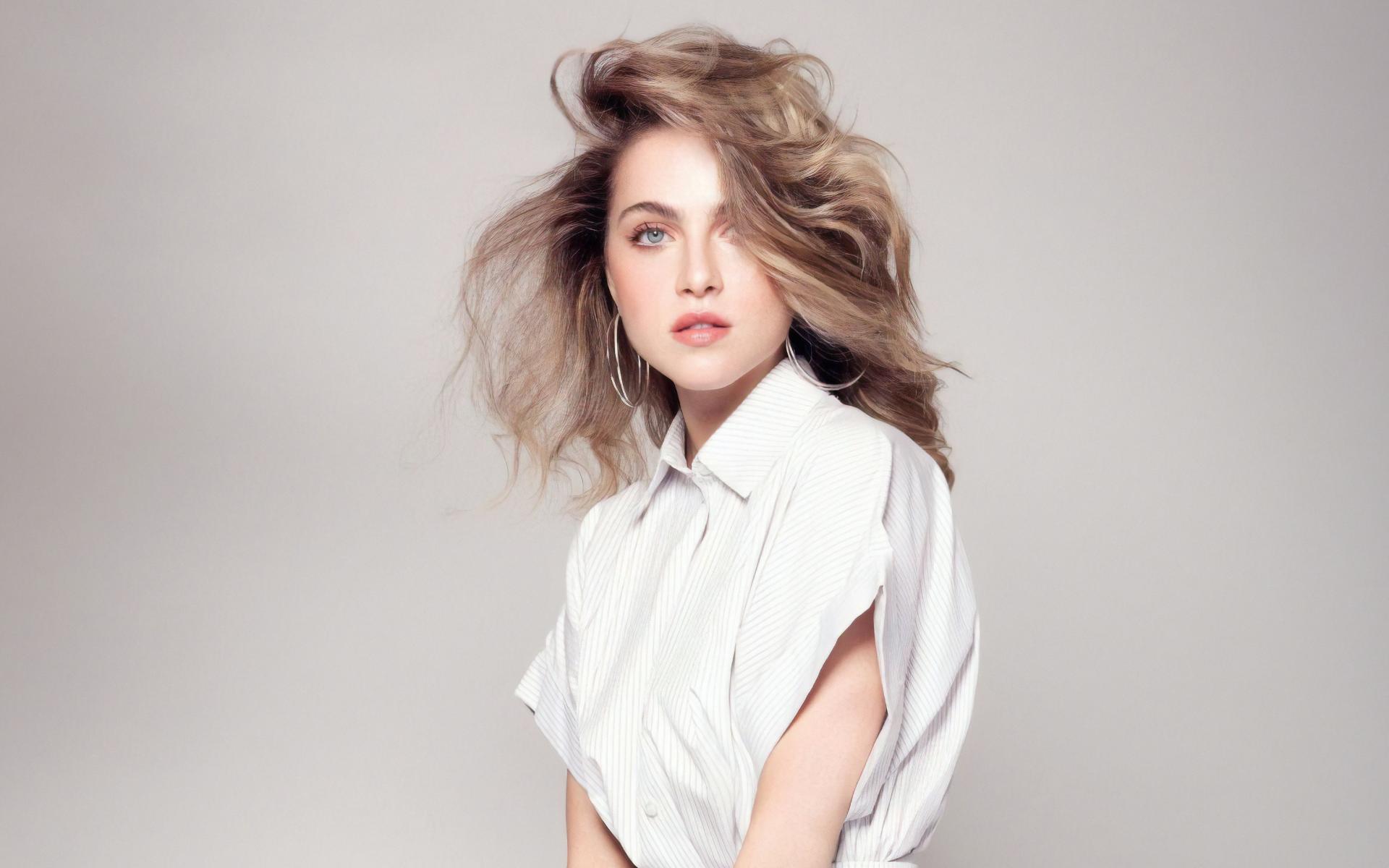 Обои Голубоглазая девушка Энн Уинтерс на сером фоне