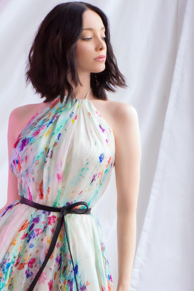 Обои Актриса Эмма Дюмон в красивом платье у окна