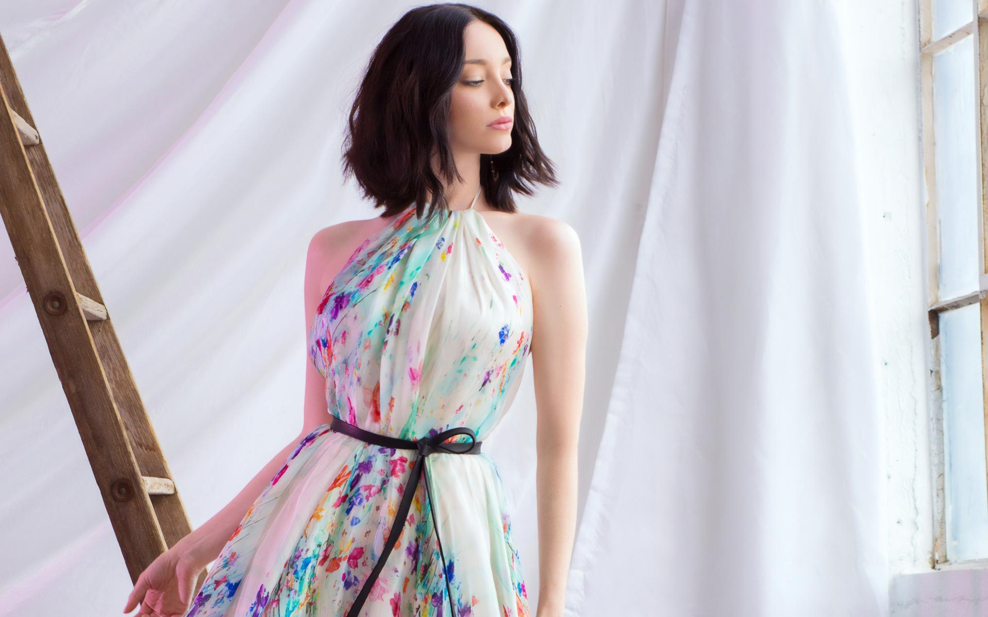 Обои Актриса Эмма Дюмон в красивом платье у окна