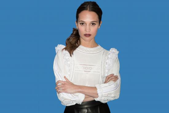 Обои Актриса Алисия Викандер в белой блузке на синем фоне