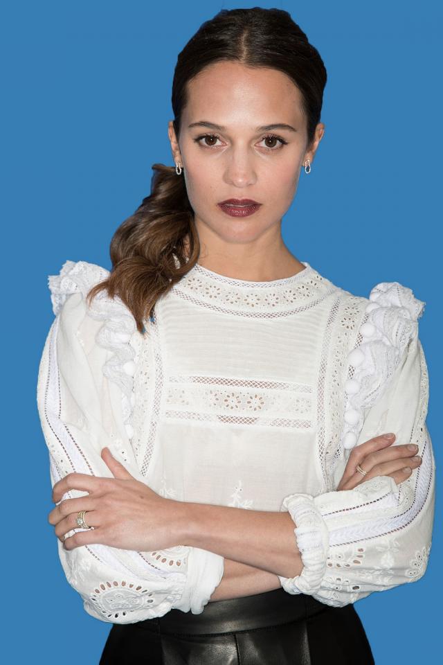 Обои Актриса Алисия Викандер в белой блузке на синем фоне