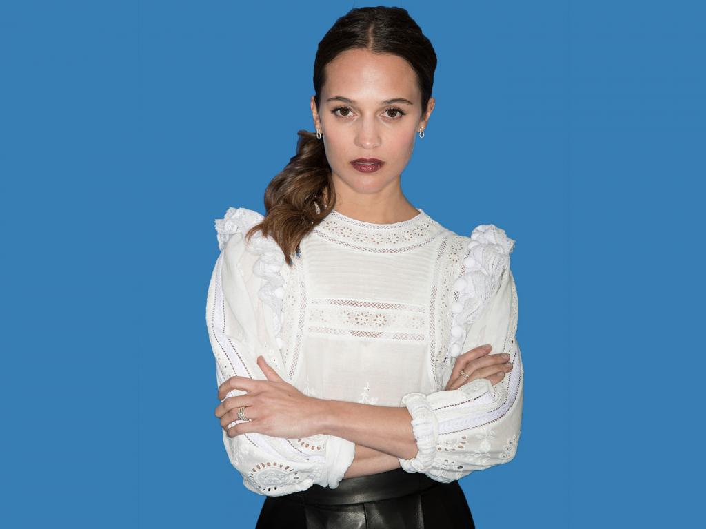 Обои Актриса Алисия Викандер в белой блузке на синем фоне