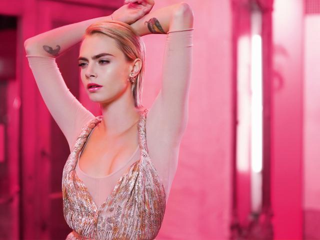 Обои Красивая девушка актриса Кара Делевинь на розовом фоне