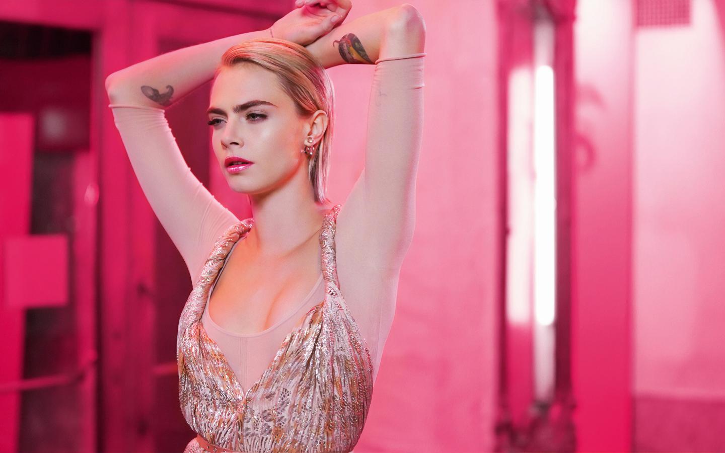 Обои Красивая девушка актриса Кара Делевинь на розовом фоне