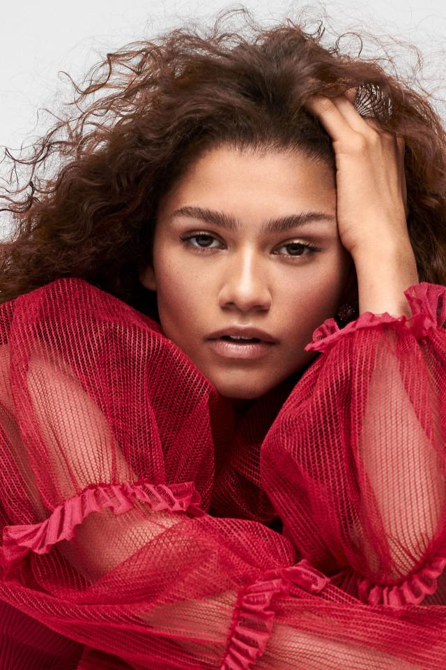 Обои Кареглазая актриса Зендая в красном наряде с рукой в волосах