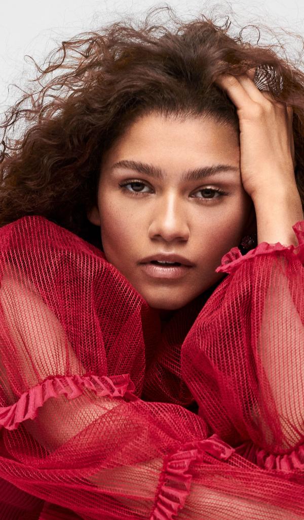 Обои Кареглазая актриса Зендая в красном наряде с рукой в волосах