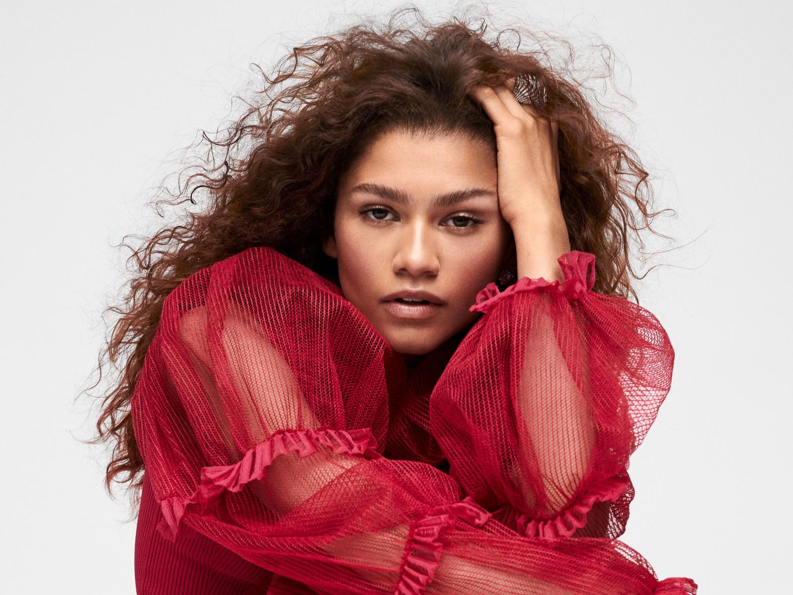 Обои Кареглазая актриса Зендая в красном наряде с рукой в волосах