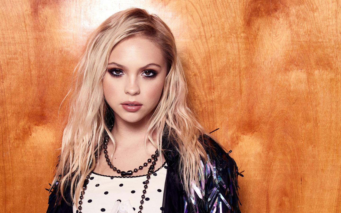 Обои Актриса Джордин Джонс на фоне деревянной стены