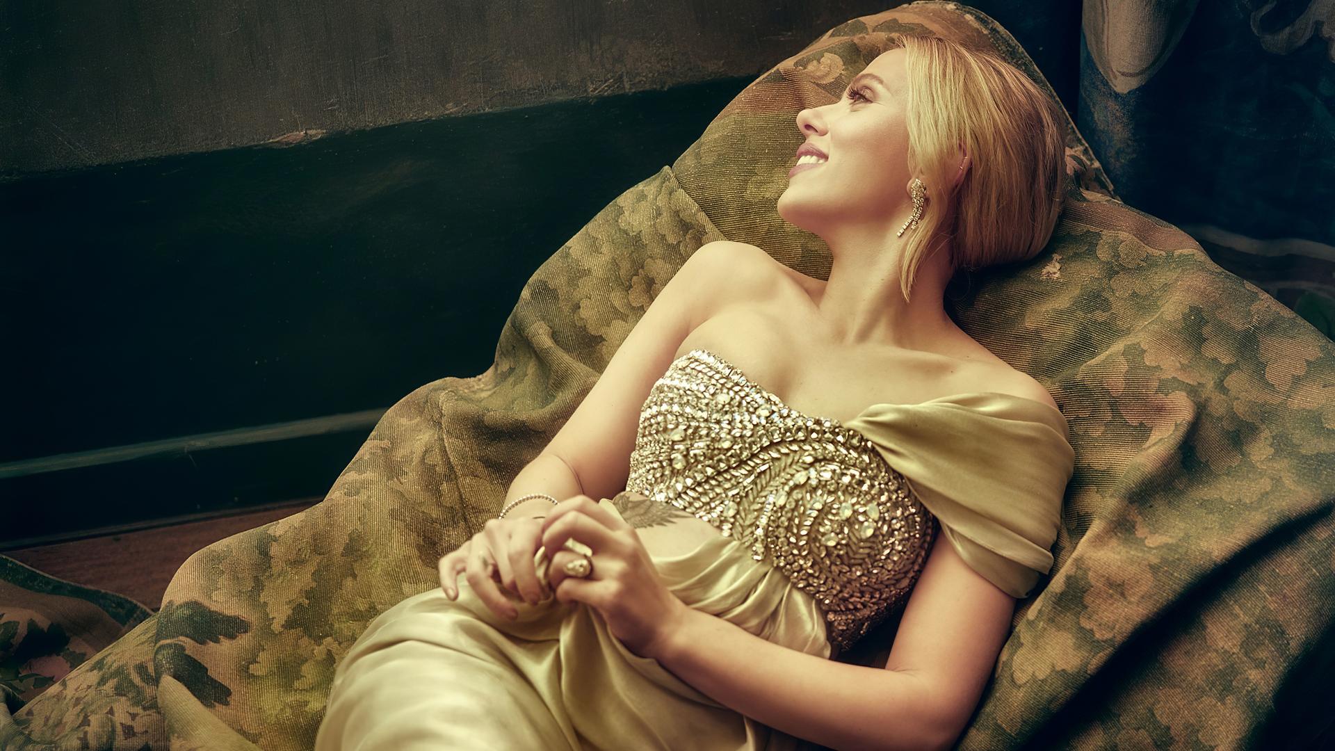 Обои Актриса Скарлетт Йоханссон в красивом платье на диване