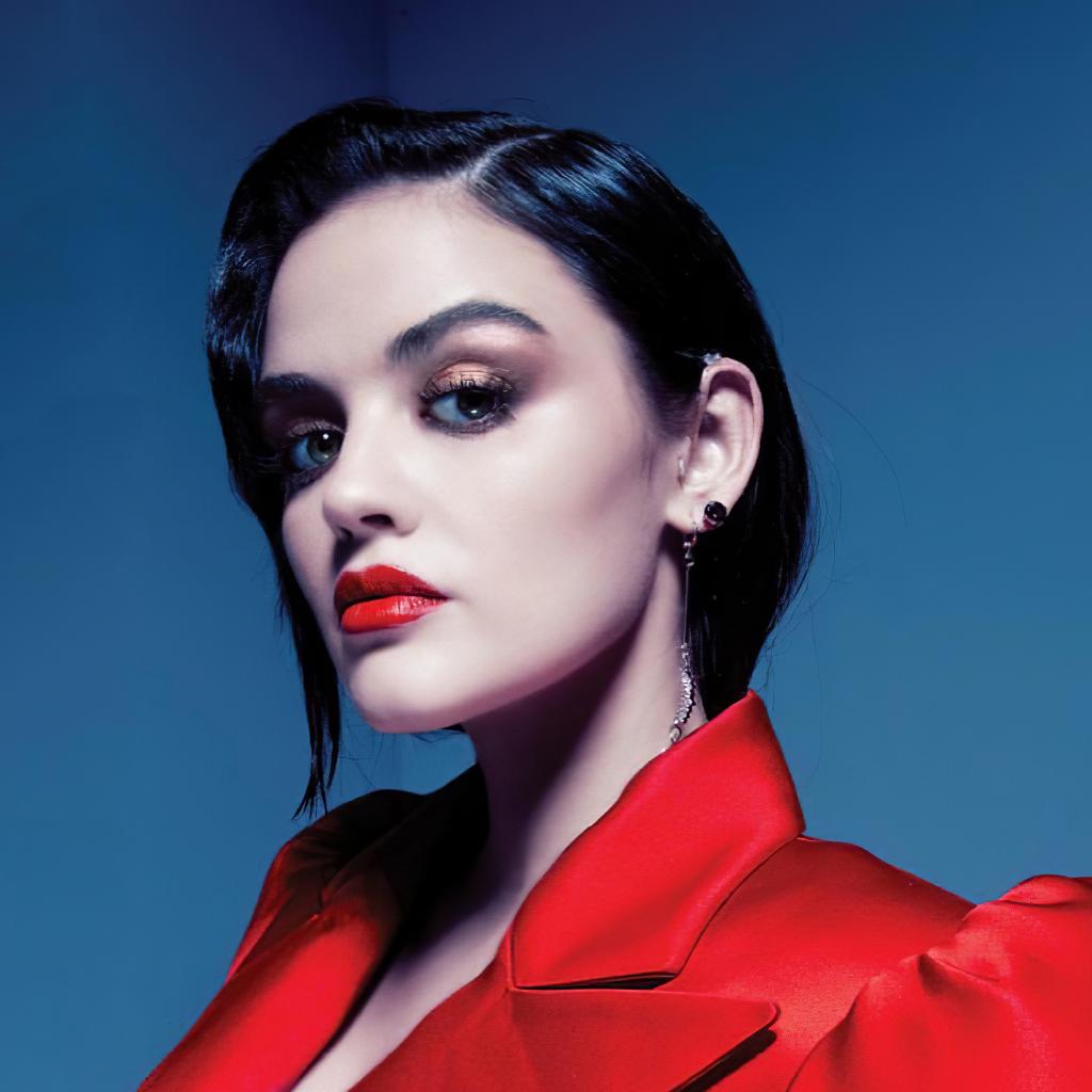 Обои Американская актриса Люси Хейл в красном наряде на сером фоне