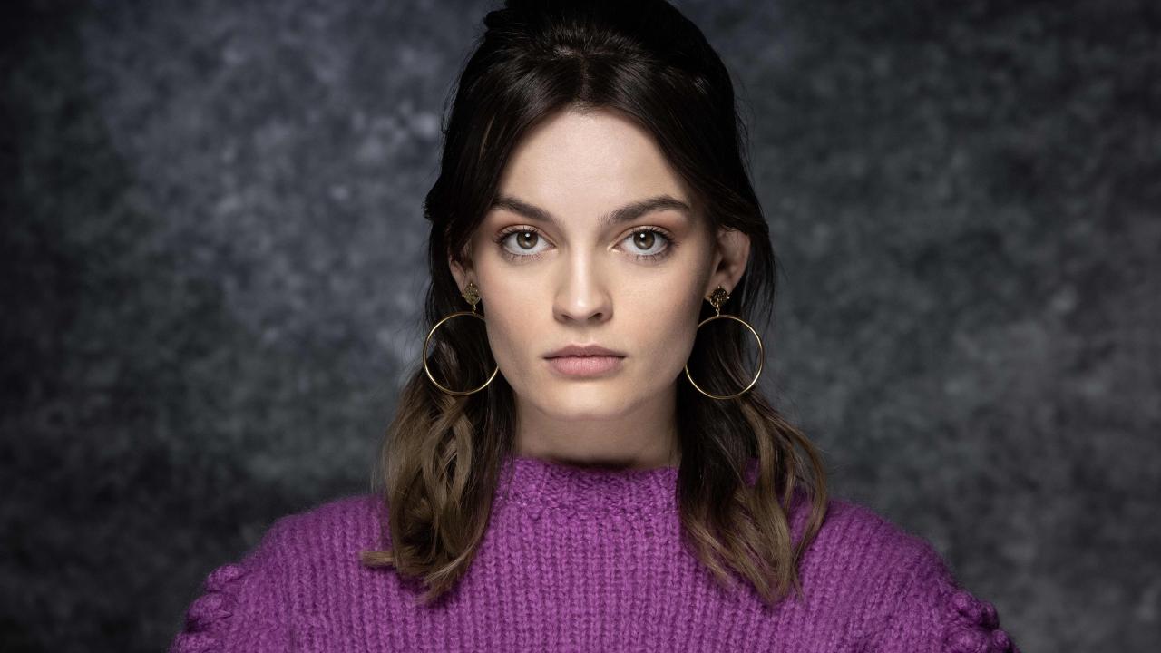 Обои Актриса Эмма Маккей в сиреневом свитере на сером фоне