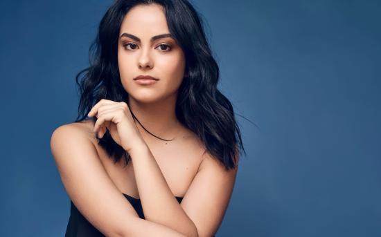 Обои Брюнетка Камила Мендес на голубом фоне