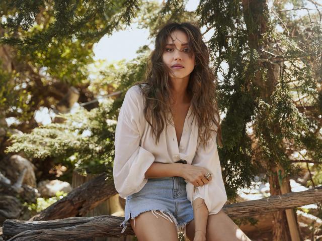 Обои Актриса Джессика Альба сидит на сухом дереве