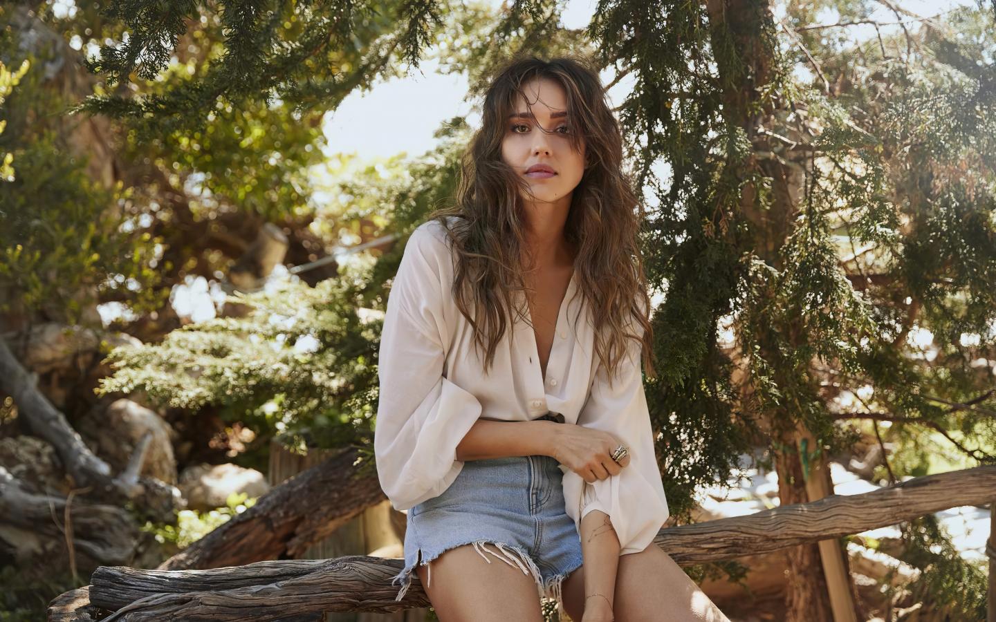 Обои Актриса Джессика Альба сидит на сухом дереве