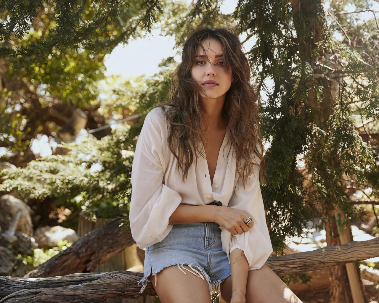 Обои Актриса Джессика Альба сидит на сухом дереве