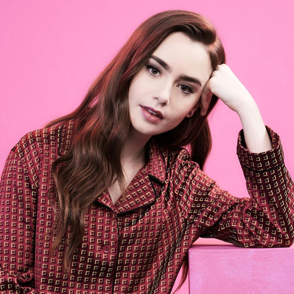 Обои Актриса Лили Коллинз на розовом фоне