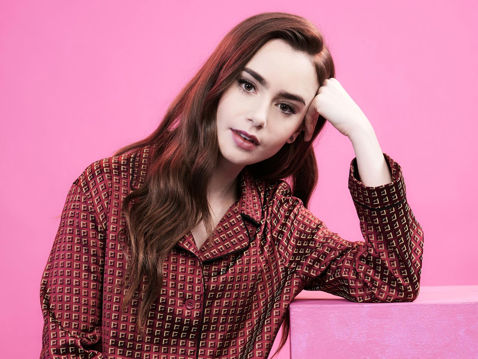 Обои Актриса Лили Коллинз на розовом фоне