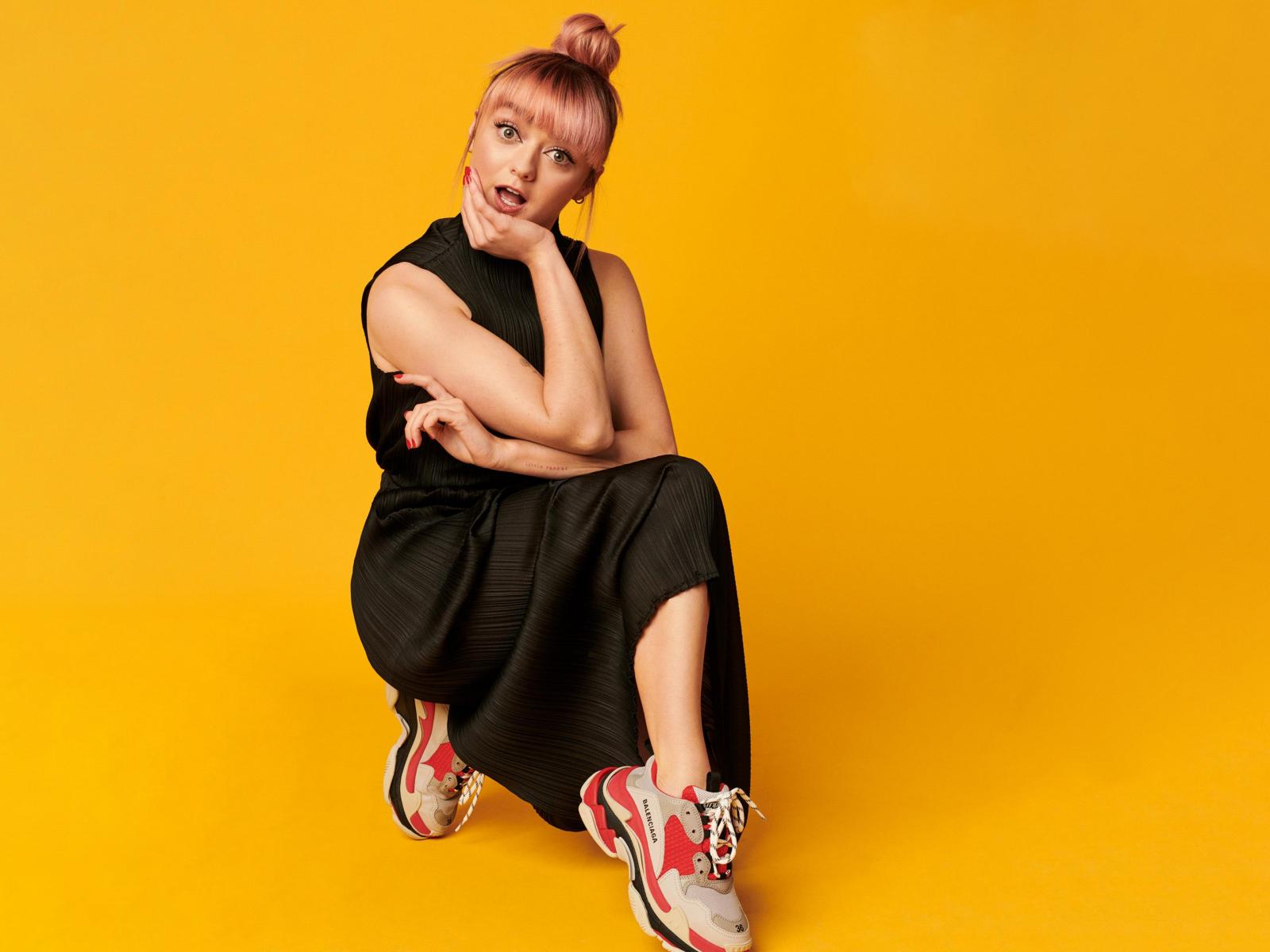 Обои Актриса Мэйси Уильямс в черном платье на желтом фоне