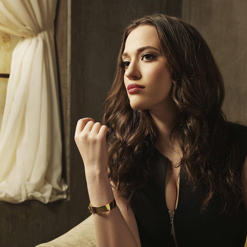 Обои Актриса Кэт Деннингс в черном наряде в кресле