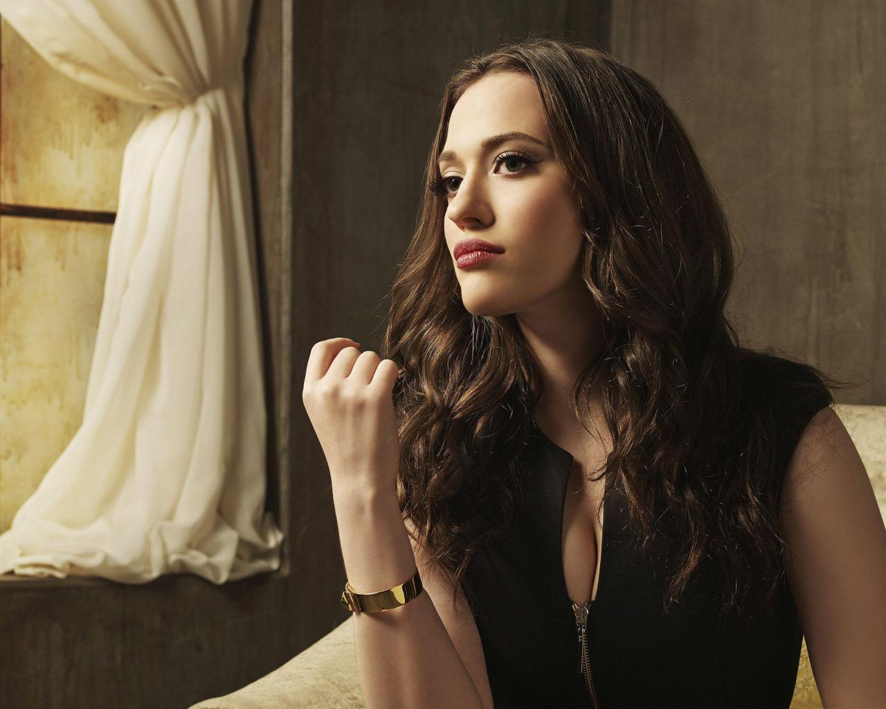 Обои Актриса Кэт Деннингс в черном наряде в кресле