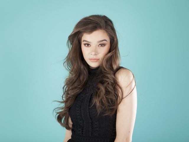 Обои Молодая актриса Хейли Стейнфилд в черном наряде на голубом фоне