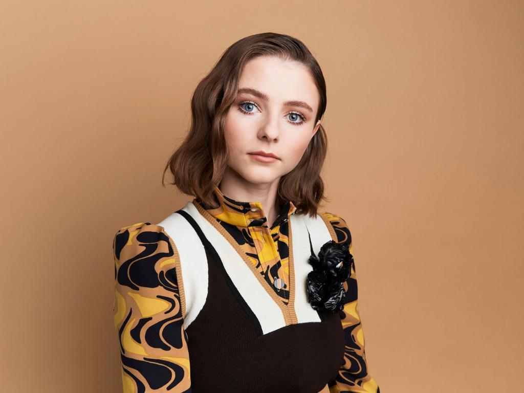 Обои Новозеландская актриса Томасин Маккензи на коричневом фоне