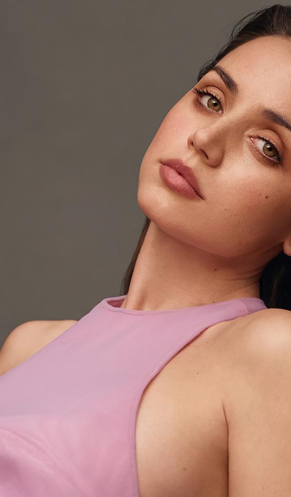 Обои Актриса Ана де Армас на сером фоне в розовой кофте
